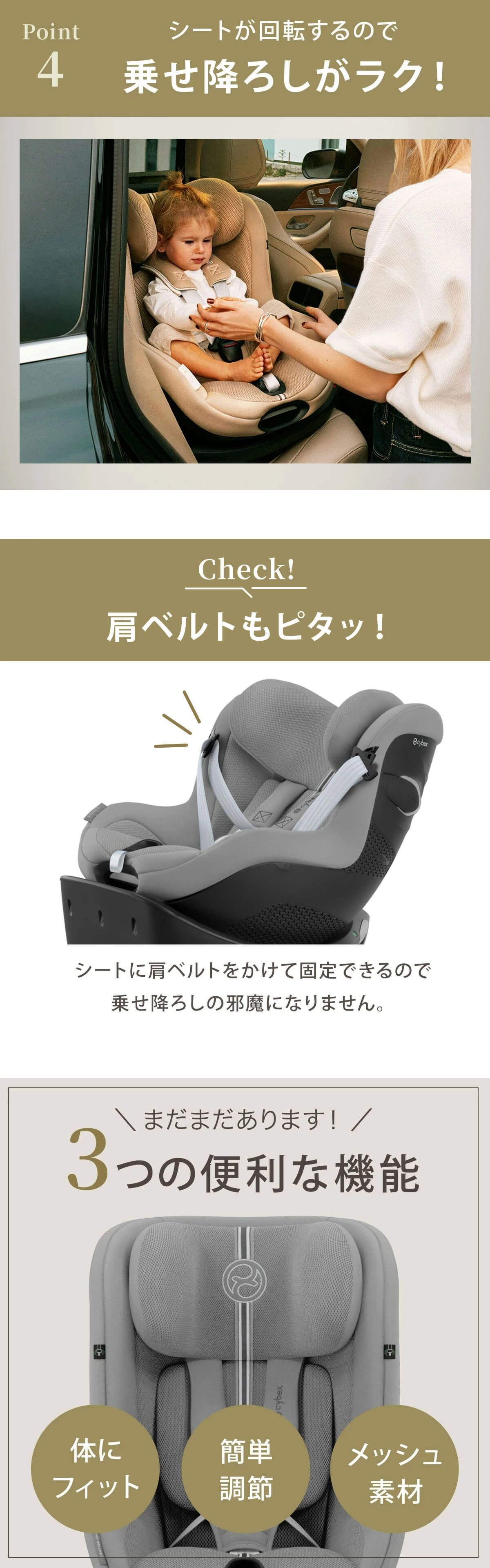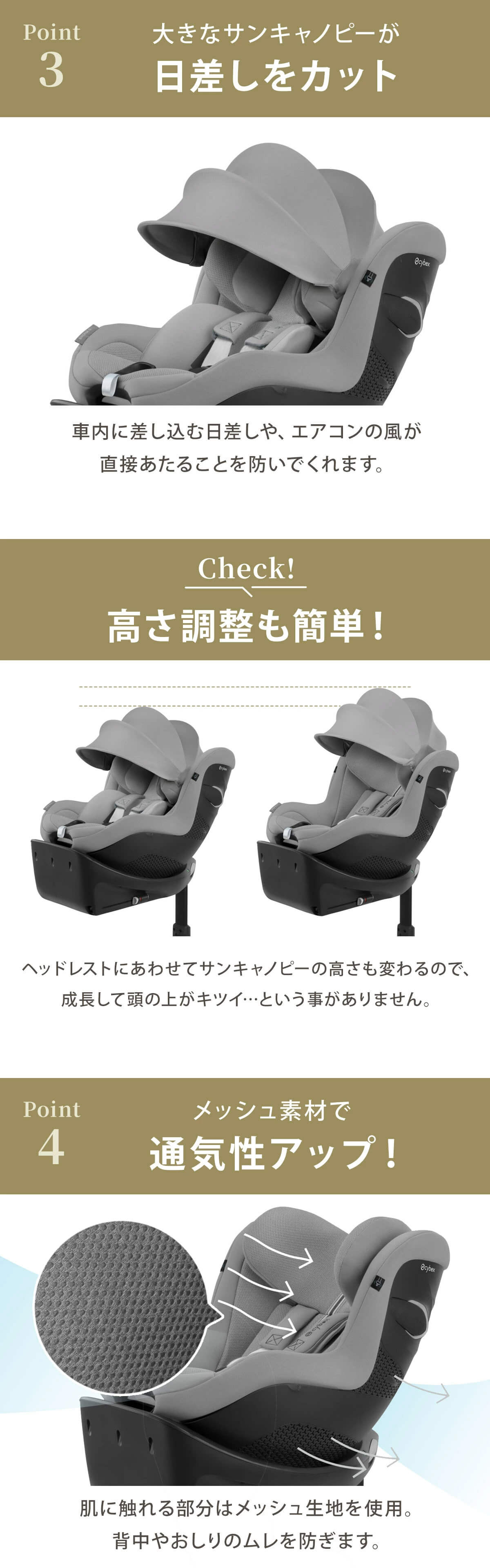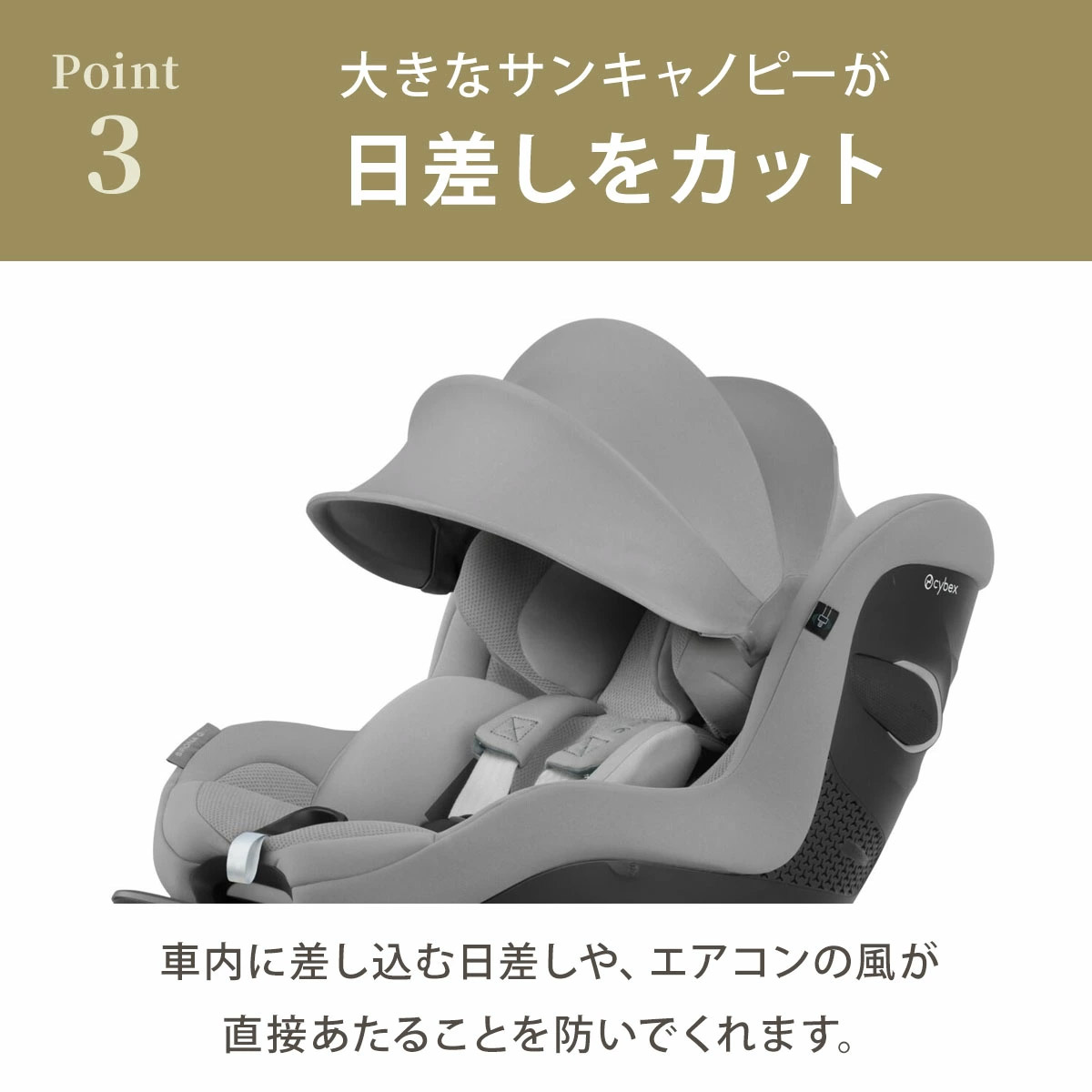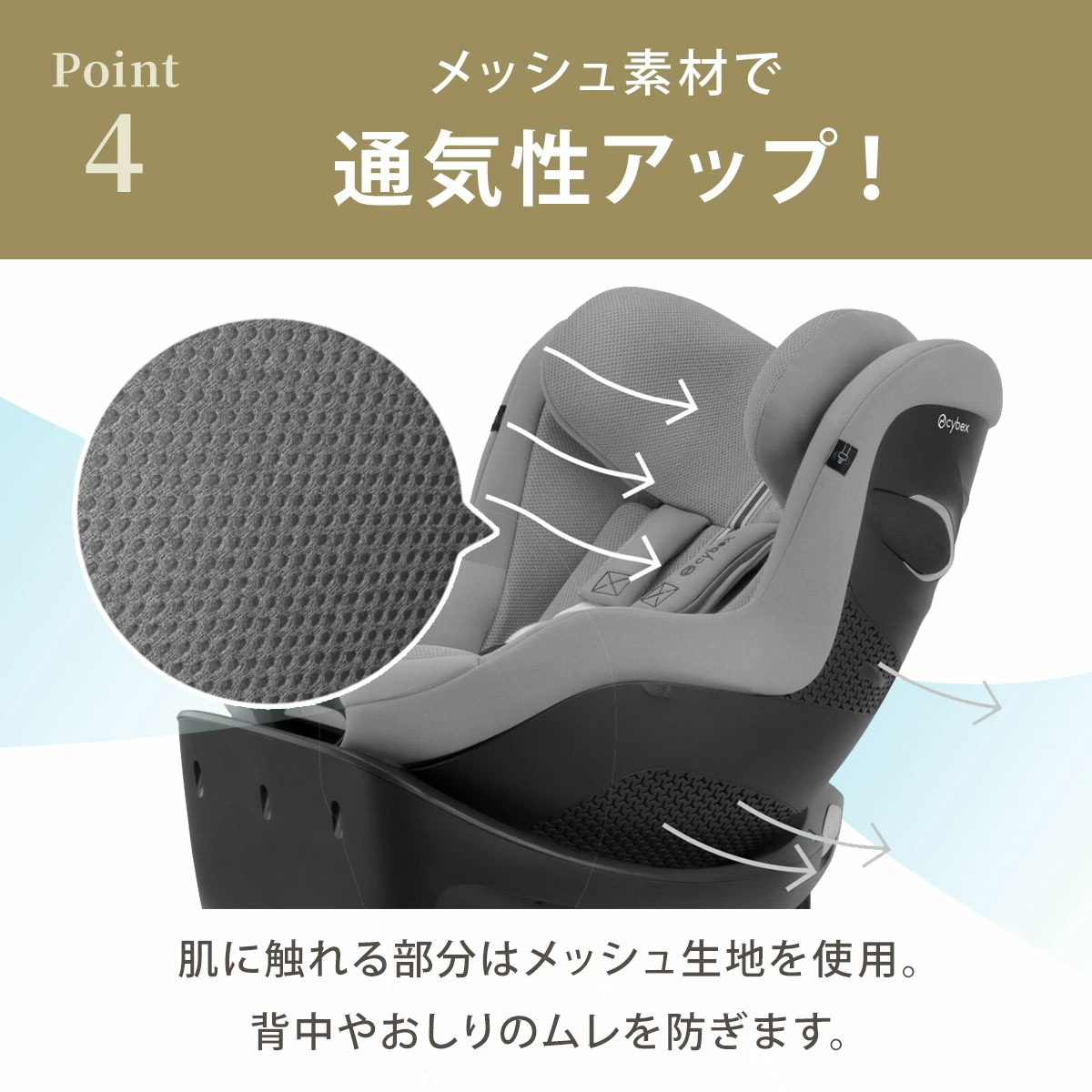 2025年新カラーが登場 ♪ 最高レベルの安全性と快適性!新生児〜4歳頃まで長く使える回転式チャイルドシート 首や腰が座っていないお子さまがより楽な姿勢で座れ、かつ安全性を担保できる姿勢を追求しました。特に新生児期のヘッドレスト(頭部)とバックレスト(上体)との角度がお子さまの呼吸を妨げにくいよう設計されています。 また低重心・低座面設計により、車の振動や急ブレーキ・カーブ時の揺れを最大限に抑え、安全性を高めています。 赤ちゃんに触れるメッシュファブリックの内側面には、通気孔を備えた衝撃吸収素材を採用。 高い安全性を確保しながら、シェルの背面から側面にわたる通気孔までスムーズに空気が通るので快適に過ごせます。 サンキャノピーは、お子さまがくつろげるよう、日差しを遮りながら透け感も確保。ヘッドレストに搭載されているので、お子さまの成長に応じて長期間ご使用頂けます。 シートは回転式でお子さまの乗せ降ろしや、乗車の向きを後ろから前へ変更(※)するときに便利です。 リクライニングは、後ろ向き5段階・前向き5段階で、よりフラットに近い角度に調節が可能。お子さまの様子や成長に合わせて最適なポジションに簡単に調節できます。 さらに、どのリクライニング角度でもシートの回転が可能になり、乗せ降ろしもスムーズ。最も安全な姿勢での快適な移動が可能です。 ※ 前向きへご変更される場合は、お子さまの身長が76cm以上であることをご確認ください。 |