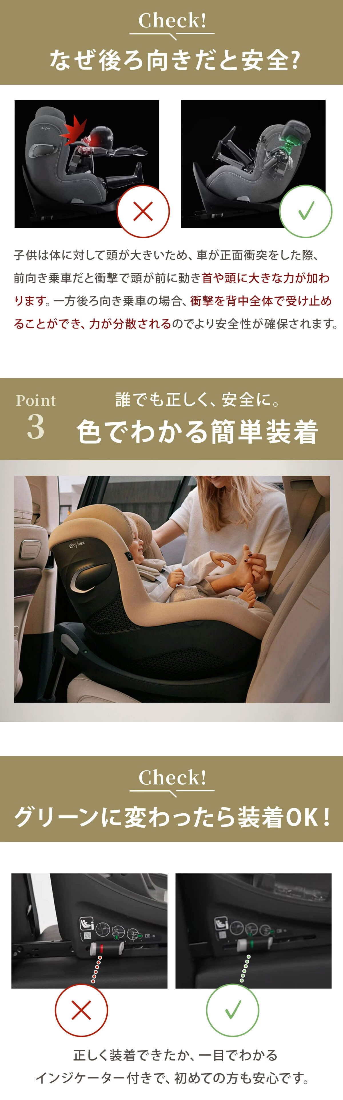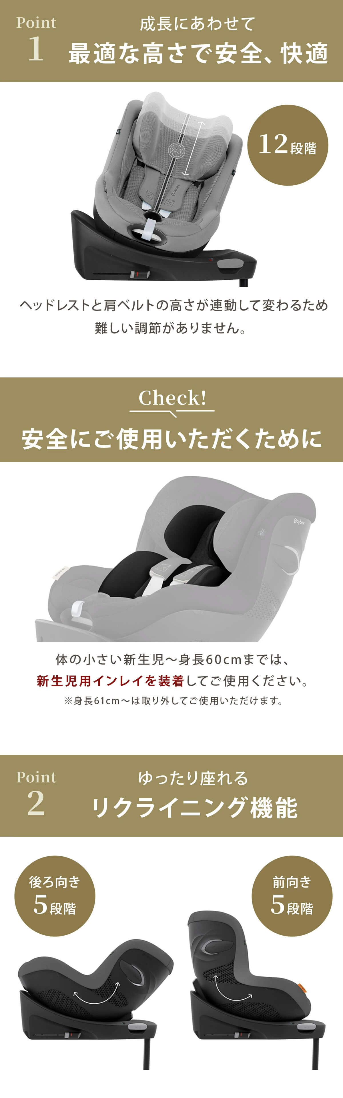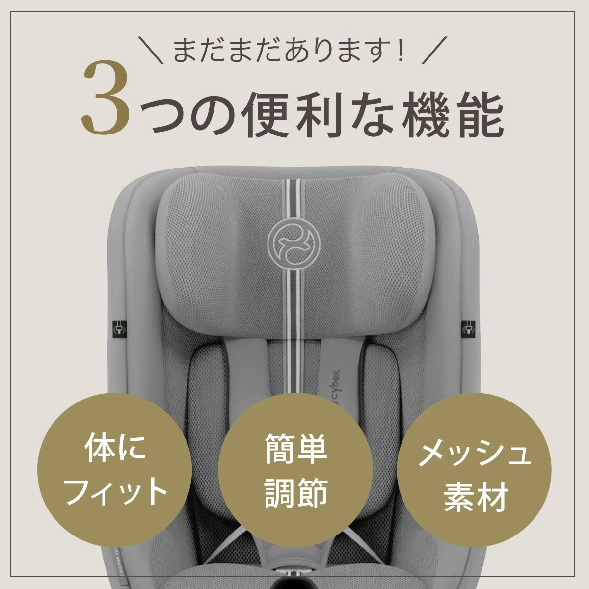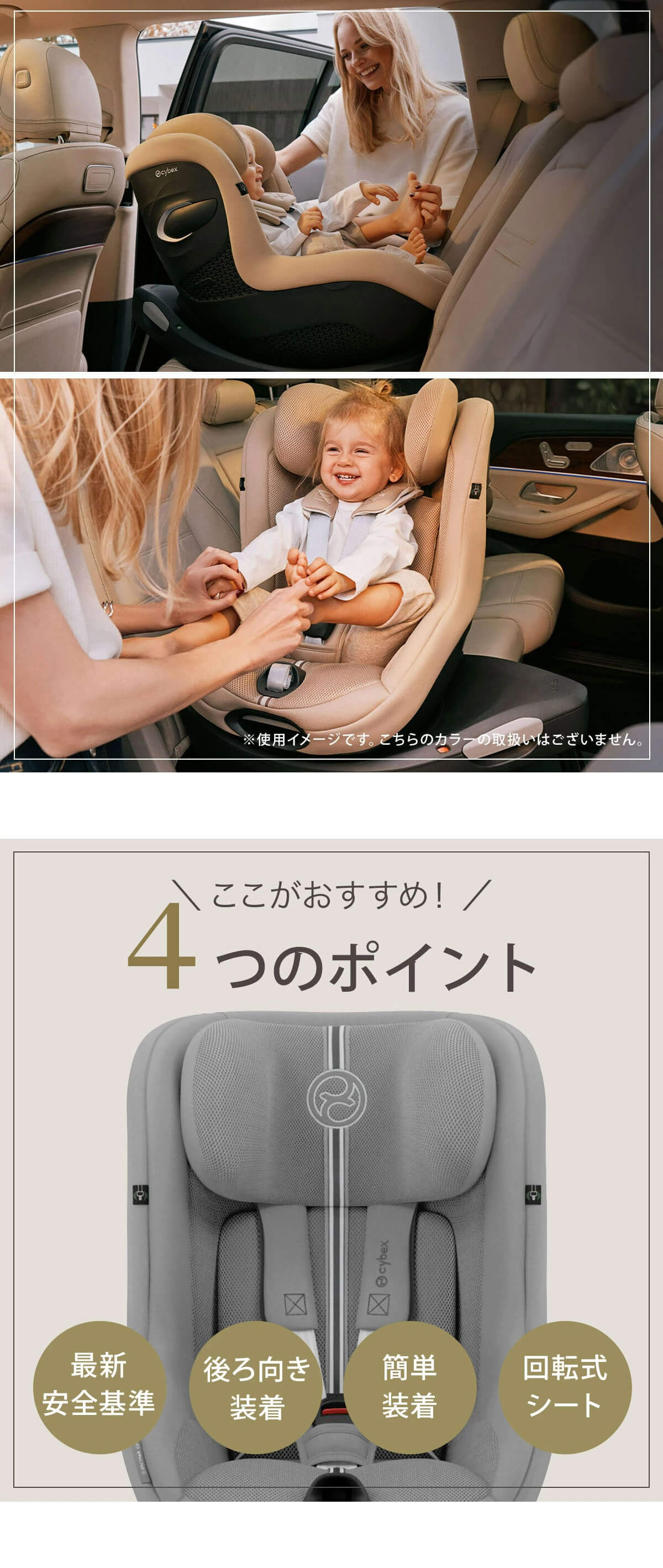 2025年新カラーが登場 ♪ 最高レベルの安全性と快適性!新生児〜4歳頃まで長く使える回転式チャイルドシート 首や腰が座っていないお子さまがより楽な姿勢で座れ、かつ安全性を担保できる姿勢を追求しました。特に新生児期のヘッドレスト(頭部)とバックレスト(上体)との角度がお子さまの呼吸を妨げにくいよう設計されています。 また低重心・低座面設計により、車の振動や急ブレーキ・カーブ時の揺れを最大限に抑え、安全性を高めています。 赤ちゃんに触れるメッシュファブリックの内側面には、通気孔を備えた衝撃吸収素材を採用。 高い安全性を確保しながら、シェルの背面から側面にわたる通気孔までスムーズに空気が通るので快適に過ごせます。 サンキャノピーは、お子さまがくつろげるよう、日差しを遮りながら透け感も確保。ヘッドレストに搭載されているので、お子さまの成長に応じて長期間ご使用頂けます。 シートは回転式でお子さまの乗せ降ろしや、乗車の向きを後ろから前へ変更(※)するときに便利です。 リクライニングは、後ろ向き5段階・前向き5段階で、よりフラットに近い角度に調節が可能。お子さまの様子や成長に合わせて最適なポジションに簡単に調節できます。 さらに、どのリクライニング角度でもシートの回転が可能になり、乗せ降ろしもスムーズ。最も安全な姿勢での快適な移動が可能です。 ※ 前向きへご変更される場合は、お子さまの身長が76cm以上であることをご確認ください。 |